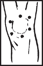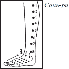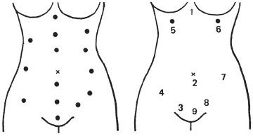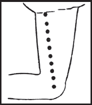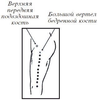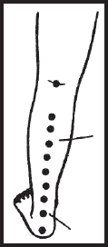 Чтобы воздействовать методом шиацу на пациента со слабой брюшной стенкой, уложите его на живот. Сядьте слева от него, поместите большие пальцы рук (один на другой) на область, расположенную между основанием левой лопатки и позвоночным столбом. При наличии каких-либо изменений эта область будет напряженной. Вначале пациента может беспокоить боль, затем она постепенно проходит. После надавливания на эту точку пять или шесть раз надавливайте примерно по три секунды на каждую из девяти точек, расположенных слева вдоль позвоночного столба сверху вниз. Точки должны отстоять друг от друга примерно на 25 мм. Повторите надавливание три раза. Затем проведите такое же воздействие на точки с правой стороны.