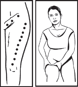 Воздействие методом шиацу на бедро и паховую область способствует сохранению общего тонуса (рис. 12). Продвигаясь вниз, надавливайте по всей длине мышц бедра сначала изнутри, потом снаружи (рис. 13, 14). Затем четырьмя пальцами рук надавливайте на заднюю поверхность ног и ягодиц (рис. 15). Появление дряблости кожи в паховой области, особенно у молодых женщин, указывает на серьезные нарушения в организме, которые должны быть немедленно устранены.