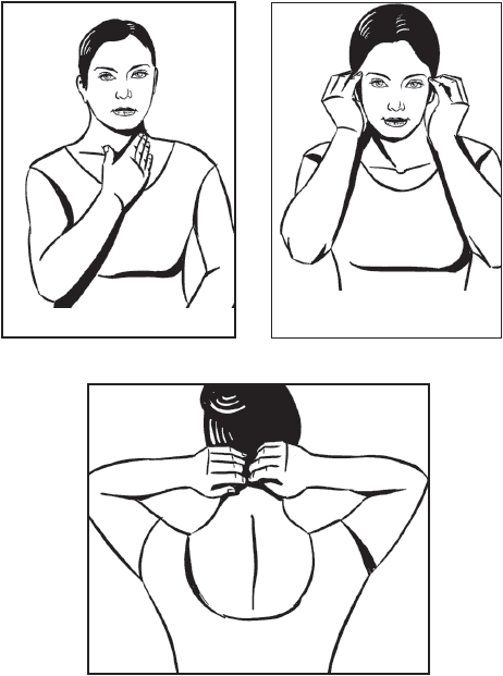 Такими же действиями можно снять напряжение мышц шеи, а также умственную усталость, понижающую ясность мышления. Надавливание на виски тремя пальцами (рис. 18), на заднюю поверхность шеи четырьмя пальцами (рис. 19), на затылок большими пальцами восстанавливает трудоспособность, позволяет легче и быстрее справиться с намеченной работой.