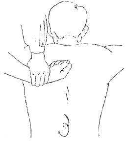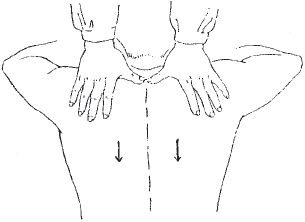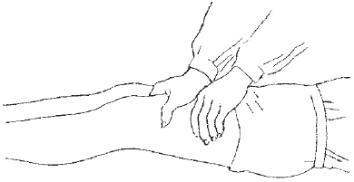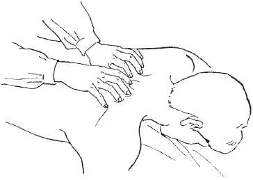 «Выталкивание» выполняется большим пальцем руки или ладонью. С силой «вытолкните» кожу вперед или под углом (рис. 1–6). Этот прием часто применяется на мышцах, которые проходят вдоль позвоночника, на межреберных ямках или вдоль меридиана. При «выталкивании» ладонью массирующее движение осуществляется основанием ладони (рис. 1–7).