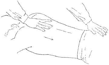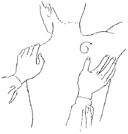 Трение может осуществляться ладонью, локтем или пальцем. Для трения ладонью используется основание ладони (рис. 1–4). Траектории движения те же, что и при прокатывании. Такие массирующие движения обычно применяют на грудной клетке и спине. Трение локтем обычно используется на ягодицах и конечностях и совершается круговыми вращательными движениями (рис. 1–5).