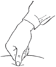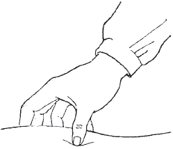 Обычно постукивание осуществляется кончиком среднего пальца и выполняется с силой (рис. 1-11). Постукивание всеми пальцами, собранными вместе, обычно выполняется со средней интенсивностью (рис. 1-12).