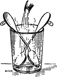 Возьмите две чайные ложки: одну серебряную, другую из никелевого сплава. Прикрепите к ним каплями стеарина скрепки для бумаг. Вложите ложки в стакан, чтобы ручки со скрепками торчали из него в разные стороны.