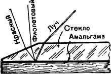 Трехгранная стеклянная призма у вас дома вряд ли есть, но зеркало из толстого стекла может быть. У зеркал из толстого стекла края всегда скошенные. Наведите с помощью маленького зеркальца на зеркало со скошенными краями солнечный зайчик. Падая на зеркало под небольшим углом, он отразится от амальгамы и выйдет наружу через скошенный край зеркала. И тогда на стене или на подставленном листе бумаги вы увидите цветовую полоску — радугу.