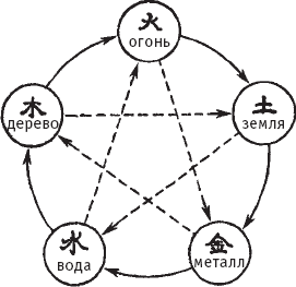 Пяти элементам присущи два основных циклических взаимодействия: взаимопорождение (на рисунке ниже показаны сплошной линией) и взаиморазрушение (пунктирная линия).
