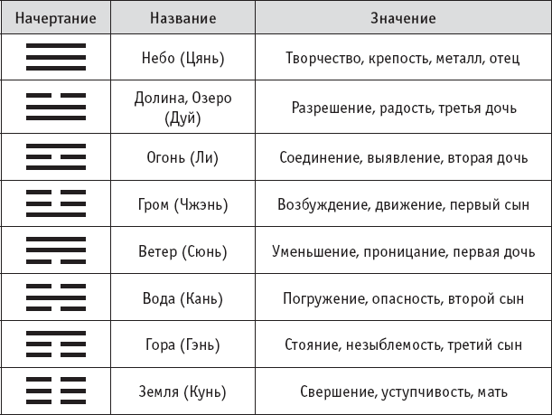 Графическое начертание триграмм (как, впрочем, и всех иероглифов) определяет их название. Например, триграмма Огонь – это Инь внутри Ян (огонь горяч, светел и активен, а внутри пуст), Вода – это Ян внутри Инь (мягкая снаружи, но жесткая и несжимаемая внутри, она способна сокрушить все на своем пути).