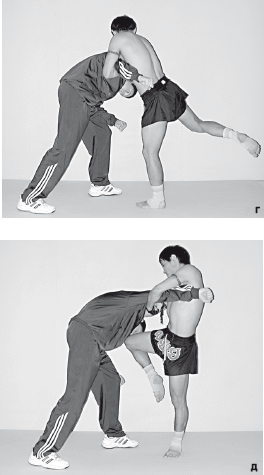 Техника выполнения: примите боевую стойку. Нанесите «стоп-удар» правой ногой. Выполните захват за голову двумя руками. Опираясь на бедро противника, выполните прямой удар левым коленом в голову.