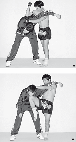 Техника выполнения: примите боевую стойку. Выполните захват атакующей ноги противника правой рукой и захват головы левой рукой, одновременно нанесите прямой удар правым коленом в пах. Скручиванием туловища противника влево нанесите прямой удар правым коленом в голову.
