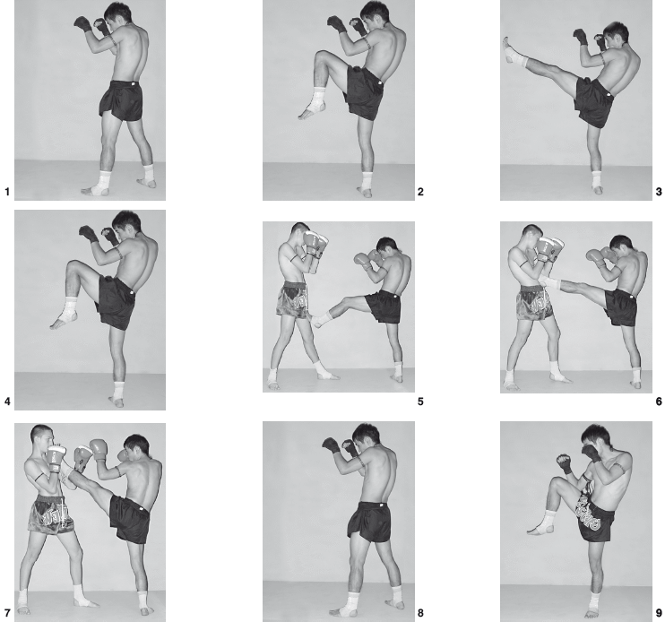 Техника выполнения: примите боевую стойку. Перенесите вес на левую ногу, одновременно поднимая и направляя голень правой ноги вперед (фото 23–24).