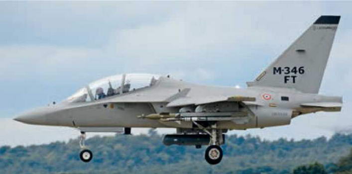На нынешнем авиасалоне в Фарнборо итальянцы представили два новых варианта своей машины. Первый из них - участвовавший в демонстрационных полетах учебно-боевой M-346FT (Fighter Trainer) - отличается от серийной учебнотренировочной версии включением в состав оборудования системы управления вооружением, тактической системы обмена информации и аппаратуры РЭБ. На пяти точках подвески вооружения он может нести ракеты «воздух-воздух», управляемые бомбы Paveway II калибра 227 кг (GBU-12 и GBU-49), JDAM и SDB, ракеты Brimstone, а также прицельный контейнер.
