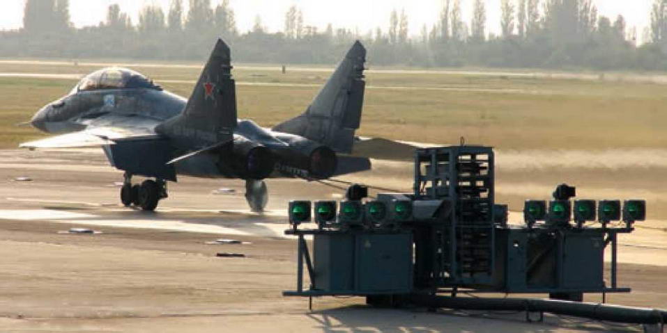 Торможение МиГ-29К аэрофинишером. На переднем плане - оптическая система посадки «Луна»