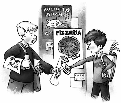 Лёха торжествовал, но скоро убедился, что это всего лишь тактическая хитрость. Стоило ему отойти, как Женька вероломно вернулся и пристроил рекламу пиццы на прежнее место. Хорошо ещё, что Лёха обронил возле столба колпачок от тюбика с клеем. Он тотчас восстановил справедливость.