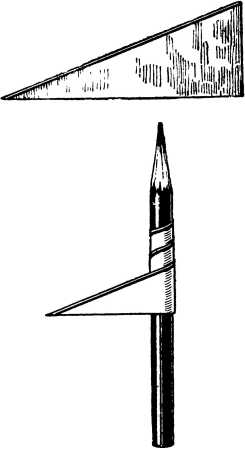 Возьмите катушку, вбейте в ее торцовую часть (по обе стороны отверстия) по небольшому гвоздику без шляпок. Затем вырежьте из жести силуэт удлиненной восьмерки, загните в разные стороны его лопасти, проделайте в его середине два отверстия, чтобы в них свободно могли входить вбитые в торец катушки гвоздики без шляпок.