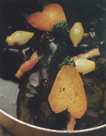 Созревая, шатонёф-дю-пап приобретает нотки специй, перца и древесины, в его букете проявляются тона трюфелей, инжира и сушеных фиников, а иногда шерсти дичи, к которым добавляется легкий привкус старого вина, называемого рансьо (rancio). Все это делает вино превосходным партнером блюд из трюфелей, которыми изобилует этот регион. Шатонёф-дю-пап составляет гармоничный союз с рагу из трюфелей, с запеченными трюфелями (букв, «трюфель под пеплом», la truffe sous le cendre), с пастой с трюфелями (les p^ates aux truffes), образуя с этими блюдами несравненное сочетание аромата и вкуса. Но самым предпочтительным партнером для этого насыщенного вина будет выступать дичь «с шерстью», например рагу из зайца (li`evre en civet), с ярким животным вкусом, который иногда кажется слишком пикантным. Соус на основе крови животного также требует присутствия этого яркого южного вина.