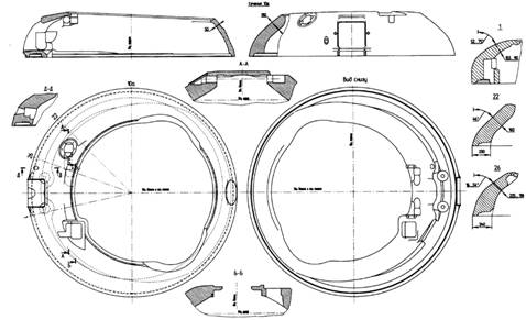 В верхней части лобовой брони башни, с левой стороны, имелась сквозная шахта для установки прицел-дальномера, а с правой стороны – углубление для размещения головки базовой трубы дальномера, для прохождения которой в корпусе башни предусматривалось специальное отверстие. Сверху к корпусу башни приваривалась цельноштампованная крыша.
