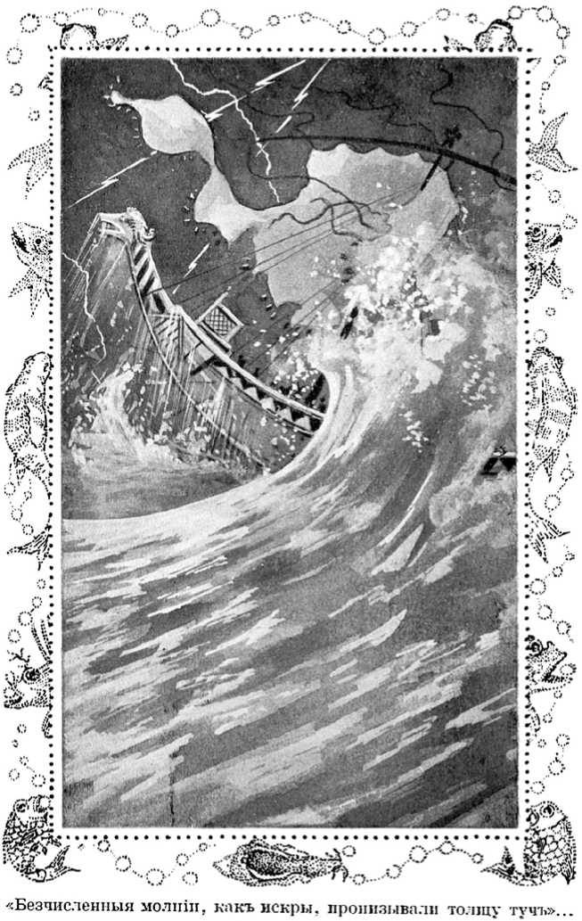 Низко спустившийся над нами темно-свинцовый полог с багровыми краями закрыл весь небосклон, но продолжал все более спускаться, почти касаясь до поверхности глухо ревущих вод, поверх которых, точно вспышки фосфора, белели пряди пены. Бесчисленные молнии, как искры, пронизывали толщу туч, громовые раскаты сливались с безумным свистом урагана, а горы, выросшие из разъяренных вод, в стихийной ярости со всех сторон неслись на нас и рушились у борта корабля, смывая с палубы все уцелевшее на ней.