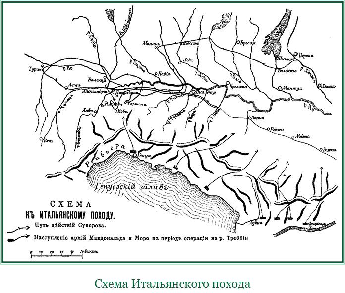 Обе императорские российские дивизии под командою генерала от инфантерии Розенберга идут немедленно к Павии, переправляются чрез Тичино теперь на судах, а потом по мосту.