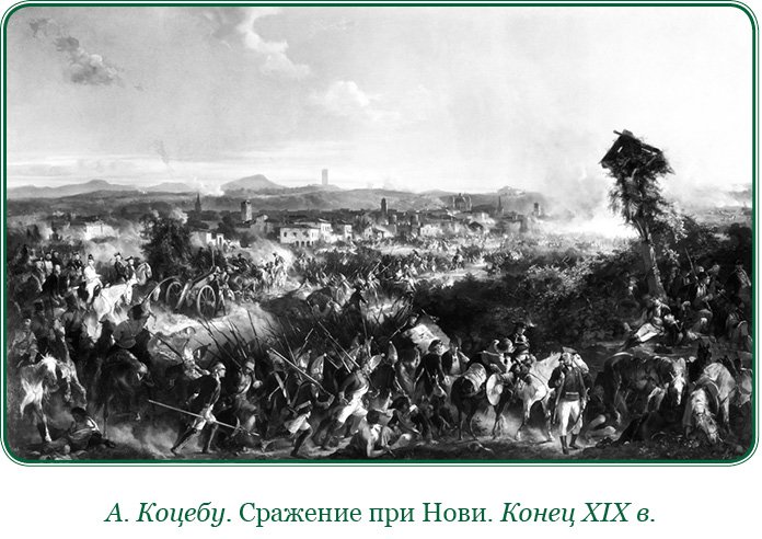 Неприятельская армия, из до 45 000 состоявшая, под главным предводительством нового, доверенность войск имевшего и храбростию славившегося генерала Жуберта, приближалась к генуэзскому городу Нови. Она расположилась на хребтах высоких, утесистых близлежащих гор, имев позади левого своего крыла крепость Гави, а правым простираясь до Сераваля. Таковое самою природою укрепленное местоположение, доставляя неприятелю всевозможные выгоды оборонительной позиции, соделывало всякое покушение на него неприступным. Он решился учинить на наши войски сильное внезапное нападение; но от меня приказано уже было предускорить сему прежнею [на] ею атакою и, подаваясь мало-помалу назад, завлечь его в открытое поле. Для вяшщего споспешествования сим нашим предположениям оставили мы 2-го августа город Нови.