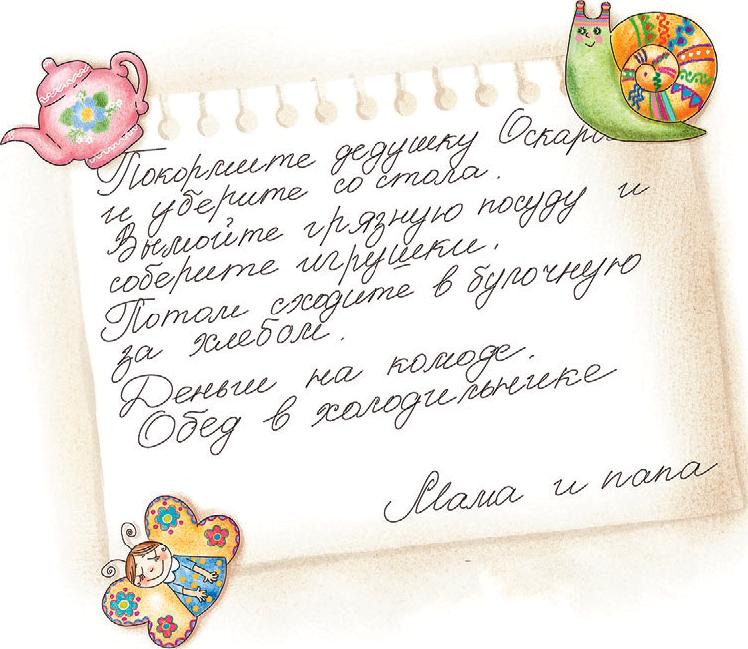 «Покормите дедушку Оскара завтраком и уберите со стола. Вымойте грязную посуду и соберите игрушки. Потом сходите в булочную за хлебом. Деньги на комоде. Обед в холодильнике. Мама и папа».