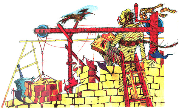 …Удивлению жителей Яна не было предела при виде странной процессии. Путешественники шли по улицам, а горожане глазели на них, разинув рты. Папаша Дуралей, по обыкновению, хохотал. Он смеялся так заразительно, что к нему присоединился принц со своими спутниками, а потом начали робко смеяться и горожане. Дикий хохот достиг королевского дворца, и король вышел на балкон взглянуть, что так развеселило его подданных. Мы не знаем, о чем он подумал, увидев родного племянника в клоунском наряде в сопровождении шестнадцати таких же ненормальных.