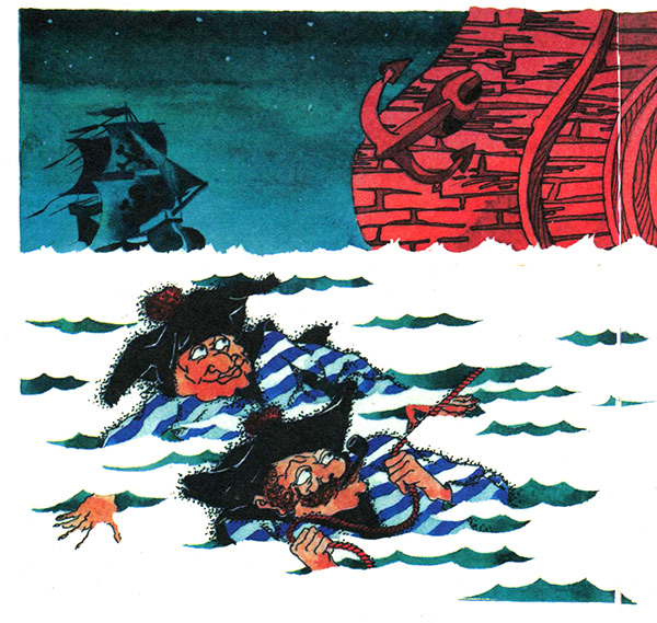 — Что же я скажу купцам?! — убивался капитан Коваджос. — Предстоящий праздник будет омрачен таким неприятным событием! Но потерянного не вернешь. Надо мужественно встретить беду. Только я, пожалуй, перейду на борт «Рога изобилия». Я соскучился по своей каюте и коврам на палубе. А помощник пускай остается на пиратском судне и продолжает вести нас на веревочке!