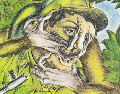 Жилистые пальцы схватили капитана за горло, вцепились в подбородок, с невероятной силой потащили его вверх, запрокидывая голову. В лицо пахнуло огненным дыханием. вонзая когти, на него карабкались сразу трое. Автомат сержанта плюнул короткой очередью и замолк. Краем глаза капитан увидел, что коричневые тела накрыли его, копошащийся клубок покатился по поляне, на секунду показалось лицо: "Стреляй, командир, стреляй!" — и опять исчезло, захлестнутое обросшими шерстью руками.