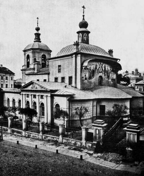 Храм Николы Явленного, относящийся к XVII в., со второй половины 1830-х гг. и до 1860 г. активно перестраивался. Семья Хомяковых (и, в частности, мать Алексея Степановича, Мария Алексеевна) была хорошо известна своей деятельностью, связанной с храмостроительством и пожертвованными на это денежными вкладами. Из чего нельзя исключать участия этой семьи в благоустройстве храма Николы Явленного: ведь когда церковь была снесена в 1846 г., на ее месте закипело строительство нового храма. В конце многих перестроек храм представлял собой большое однокупольное четырехстолпное здание в псевдорусском стиле. В 1885 г. слева был устроен новый придел Кирилла и Мефодия. Шатровая колокольня осталась древняя, времен 2-й половины XVII в., являя собой один из лучших образцов московских шатровых колоколен.