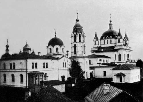 Храм Христа Спасителя и (справа) церковь Похвалы Пресвятой Богородицы в Башмаках (XVII в., уничтожена в 1931 г.)