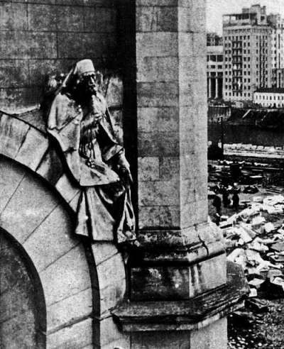 Несмотря на протесты новомучеников и исповедников Российских – таких, как отец Александр, – церковь в Охотном ряду все же не пощадили. Остановить огромный маховик преустройства города на большевистский лад было почти невозможным делом. А причина состояла еще и в том, что по Генеральному плану социалистической реконструкции Москвы 1935 г. в Охотном ряду была запроектирована парадная городская магистраль – под предполагаемым названием «проспект Ильича». Она должна была проходить по оси «северо-восток – юго-запад»: от Измайловского парка через Каланчевку, район Мясницкой, Лубянскую площадь, Театральный проезд, Охотный ряд, Волхонку, Остоженку и далее до Ленинских гор. По плану широкая, «прямая, как струна, аллея Ильича» пролегала через площадь Дворца Советов и вела к нему с окраин города. «Многотысячным человечьим потоком потекут сюда людские волны», – обещали пропагандистские книжки. «Представьте себе массовый праздник в социалистической Москве, когда десятки тысяч отдыхающих пролетариев будут проходить по аллее Ильича, ликовать на полях массовых действ, отдыхать на воде. Воздушная подвесная дорога несет все новые и новые партии москвичей над Москвой-рекой на зеленые Ленинские горы, откуда открывается волшебная панорама новой Москвы, уже без блестящего медного купола б. храма Спасителя, но с возвышающимся силуэтом из металла, бетона и стекла – величественного здания Дворца Советов». В 1928 г. церковь Параскевы Пятницы снесли, а на ее месте в 1932–1935 гг. возвели Дом СТО (Совета труда и обороны СССР); затем в нем размещались Совет народных комиссаров (правительство) СССР и Государственный плановый комитет при Совете Министров (Госплан) СССР.