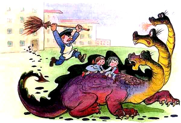 Змей Горыныч с ребятами на спине бросился наутёк… но дядя Федя догнал его. И досталось же Змею Горынычу!