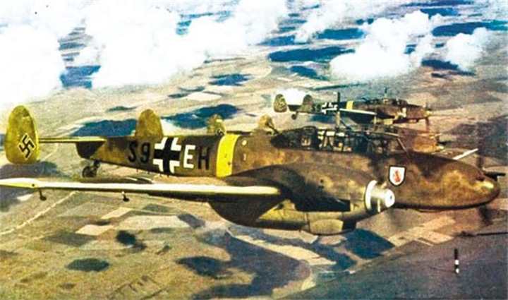 Немецкие самолеты «Мессершмитт BF.110E-2/N» из 1./SKG210 в полете над территорией СССР. Самолет на переднем плане потерян на Украине в районе аэродрома Трембовля во время боевого вылета 1 июля 1941 года. Пилот и радист погибли