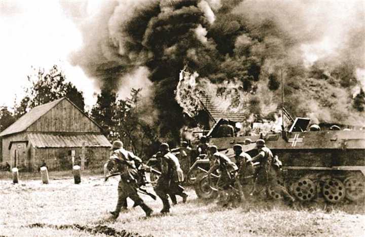 Пехотное подразделение Вермахта при поддержке полугусеничных бронетранспортеров SdKfz. 251 Ausf. C входит в горящее белорусское село. 26 июня 1941 г.