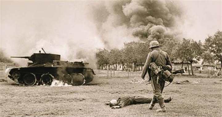 Подбитый советский танк БТ и убитый танкист. Южный участок фронта, июнь-июль 1941 года