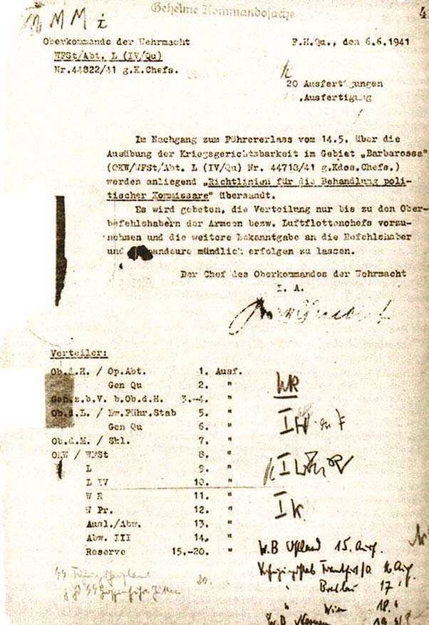 «Приказ о комиссарах» (Kommissarbefehl) – секретный приказ от 6 июня 1941 года, отданный Верховным Главнокомандованием Вермахта немецким офицерам. Приказ предписывал: «Носителей государственной политической идеи и политических руководителей (комиссаров) следует уничтожать». Войскам сообщалось, что опознать комиссаров можно по «красной звезде с вытканными на ней серпом и молотом на рукаве». Решение о расстреле мог принять «офицер, обладающий дисциплинарной властью». Тем самым немецкие войска в приказном порядке должны были уничтожать людей, которые по всем формальным признакам (наличие униформы и табельного оружия) укладывались в определение военнопленных. В непримиримых идеологических противоречиях противников война между СССР и Третьим рейхом в чем-то перекликалась с религиозными войнами Средних веков. «Приказ о комиссарах» фигурировал в числе документальных свидетельств на Нюрнбергском процессе 1946 года.
