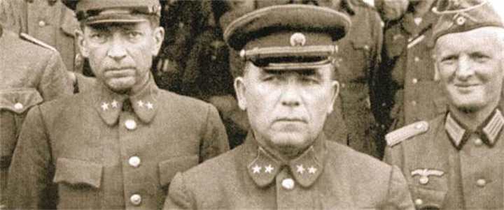 Попавшие в немецкий плен командующий 12-й армией генерал-майор П.Г. Понеделин (в центре) и командир 13-го стрелкового корпуса 12-й армии генерал-майор Н.К. Кириллов. Район Умани, август 1941 г. После пленения генералов сфотографировали с немецкими офицерами, а листовки с фотографиями разбрасывали в расположении советских частей. 25 августа 1950 г. Военной коллегией Верховного суда СССР оба генерала были признаны виновными в нарушении воинской присяги и в тот же день расстреляны