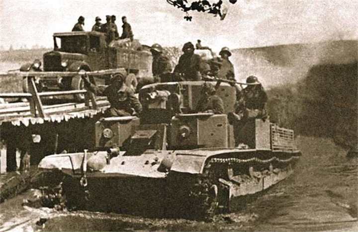 Советский средний танк Т-28 вброд форсирует речку у местечка Мир в Польше (ныне – белорусский поселок Мир Гродненской области). Сентябрь 1939 г. По мосту движется грузовая машина ЗиС-5