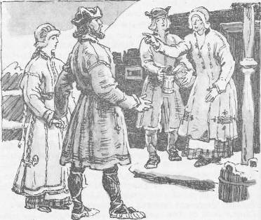 Но Крыыт была в таком воинственном настроении, когда уговоры действуют как береста, брошенная в огонь. Крыыт стала еще громче бранить кузнеца и гнать его вон. Бедный Виллу стоял, понурив голову, и не знал, как ему быть. Известно, что крикливая брань женщины больше всего пугает именно храбрецов. Могло случиться, что наш великан в конце концов обратился бы в бегство, если бы его вовремя не выручил Прийду. Он с бочонком в руках проскользнул в дом, наполнил там кружку сладким вином и поднес ее матери: