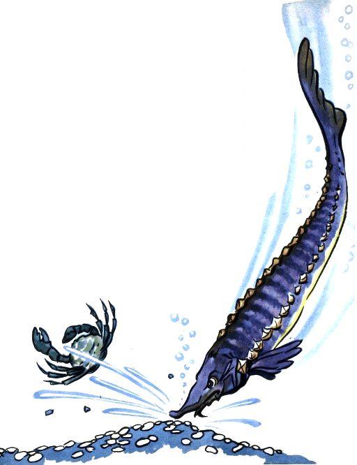 Только в ямке устроился, видит — плывёт на него огромная рыбина. Рыло длинное, снизу белые усики, спина в костяных шишках. Осётр!