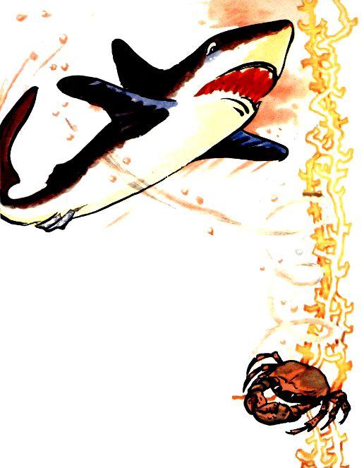 Вдруг сверху на него кто-то как бросится! На лету зубами — клац! мимо. Развернулся — и снова на крабишку. Тот удирать.