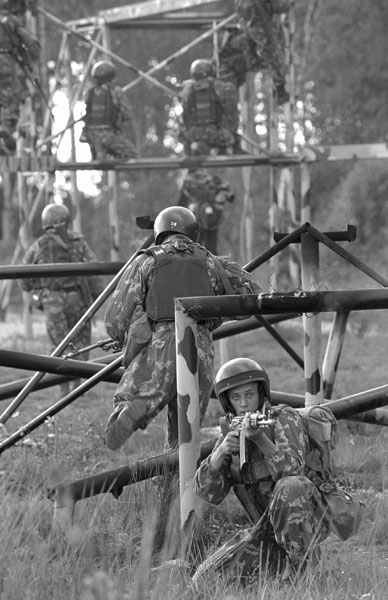 Бойцы подразделения спецназа Внутренних войск МВД РФ отрабатывают боевые действия на огненно-штурмовой полосе на базе подготовки Внутренних войск.