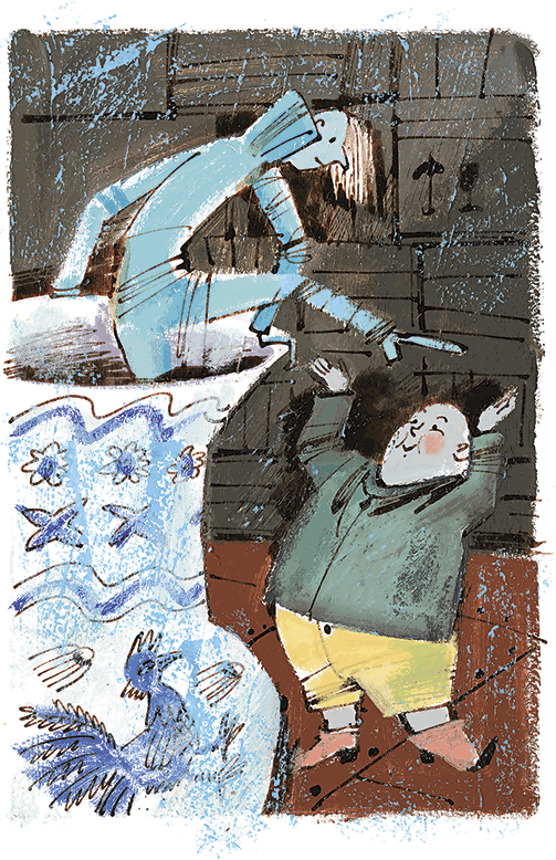Голова появилась снова, потом толстые пальцы схватились за край вазы, и наружу с трудом выбрался человек, который был сделан из нескольких шаров. Голова – шар, пузо – шар, даже его руки были сделаны из шаров. Больше всего он был похож на перекормленного младенца. На нем был черный свитер, желтые штаны до колен, а на ногах крепкие башмаки.