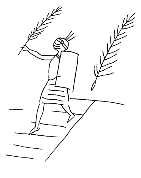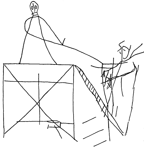 Рис. 16. Рисунок, обнаруженный на стене в Помпеях. Изображен средневековый палач в капюшоне, втаскивающий на веревке на деревянный эшафот человека в плаще.