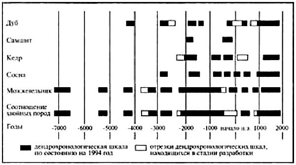 На рис. 18 по горизонтали наглядно изображены фрагменты дендрохронологических шкал, восстановленных по разным породам деревьев: дуб, самшит, кедр, сосна, можжевельник, все семейство хвойных.