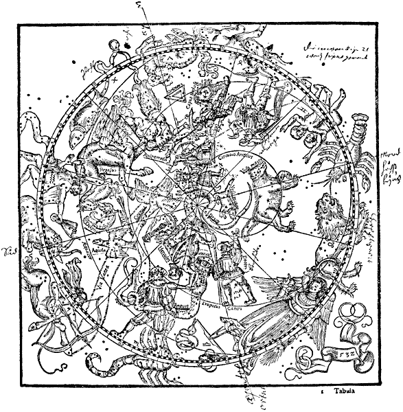 Рис. 30. Созвездия северного участка неба на звездной карте из «Альмагеста» Птолемея якобы 1551 года издания. Обращает на себя внимание, что некоторые фигуры созвездий облачены в средневековые одежды. Книгохранилище Пулковской обсерватории.