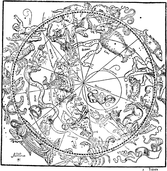 Рис. 31. Созвездия южного участка неба на звездной карте из «Альмагеста» Птолемея. Некоторые фигуры созвездий также облачены в средневековые одежды.