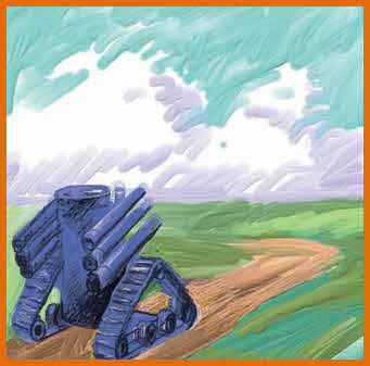 Наступило молчание. Коллеги-соперники мрачно разглядывали свои детища — две утыканные стволами и антеннами серые громадины. Боевые роботы неподвижно возвышались друг против друга, пограничный столб между ними казался маленьким, совсем игрушечным. Непосвящённому было бы трудно поверить, что эти рукотворные скалы способны сойти с места. Но «скалы» много чего умели.