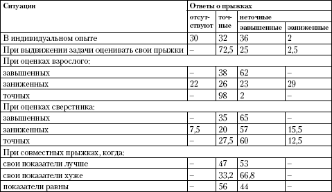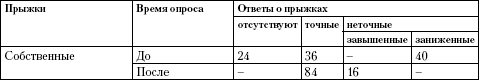 Из этой таблицы видно, что после занятий дети дали 84 % точных ответов по сравнению с 36 % до них. Среди неточных ответов отсутствовали случаи недооценки своих прыжков, а в 16 % случаев испытуемые даже завышали свои показатели, чего раньше никогда не делали.