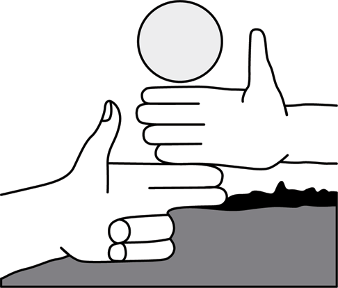 Время до захода Солнца можно определить, вытянув раскрытую ладонь на расстояние 50 см от глаз и посчитав количество пальцев, закрывающее промежуток между светилом и горизонтом; каждый палец соответствует примерно 10 минутам движения Солнца по небосводу (рис. 2.10).
