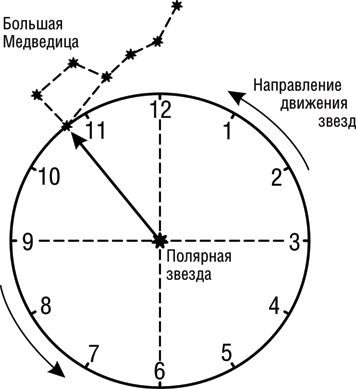По звездам. Ночью в Северном полушарии можно воспользоваться так называемыми звездными часами. Циферблатом для них служит небосвод с Полярной звездой в центре, а стрелкой – воображаемая линия, проведенная к ней через две ближайшие к Малой Медведице звезды ковша созвездия Большой Медведицы.