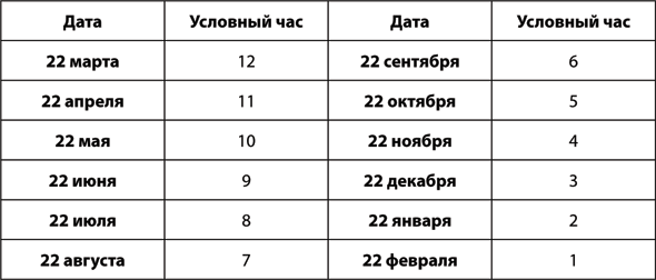 Необходимо определить, когда наступит полночь 7 ноября. По табл. 2.1 определяем, что в этот день в полночь стрелка «звездных часов» должна показывать 4 у. ч. 30 у. м., т. е. будет находиться точно посередине между 6 и 3 условными часами.